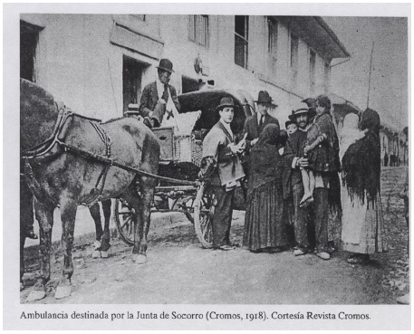 El 24 de octubre, Eduardo Carvajal y su esposa, junto con Ernesto Michelsen, miembros de la clase alta de Bogotá, quedaron estupefactos a la vista de una mujer pobre y miserable que agonizaba en la calle por la que transitaban. Conmovidos, se dirigieron de inmediato a la Gobernación y a la Alcaldía para ofrecerse como voluntarios y crear una Junta de Socorro, con la finalidad de movilizar a la gente adinerada de la ciudad en un intento por prestar asistencia a los pobres afectados por la gripa. De inmediato comenzó a trabajar la Junta, de la cual formaban parte banqueros, comerciantes y las damas de la alta sociedad. Para comienzos de noviembre, cuando comenzaba a disminuir la intensidad de la epidemia, dicho grupo ad hoc ya había creado seis hospitales provisionales en los que se trataba a los enfermos más graves; trece comedores y varios salones de costura, donde se confeccionaron 2395 prendas de vestir para los pobres. Los miembros de la Junta de Socorro hicieron 270 visitas domiciliarias para aprovisionar de ropas y alimentos a las familias con enfermos y 700 visitas a familias para prestar atención médica; como resultado de ellas, se hospitalizaron 350 enfermos. En resumen, dicho organismo privado, constituido por los notables de la capital, fue la única institución formal colombiana que realizó acciones efectivas con los afectados. No obstante, también es necesario destacar que el personal adscrito a las embajadas de Inglaterra, Francia, Bélgica, Siria y los Estados Unidos apoyó las labores de la Junta abriendo comedores y proveyendo de prendas de vestir a las familias afectadas por la enfermedad. La prensa capitalina destacó las gestiones del organismo al tiempo que reconvenía a la Junta de Higiene por su incapacidad para actuar (Martínez Martín, et al. 2014, 31).