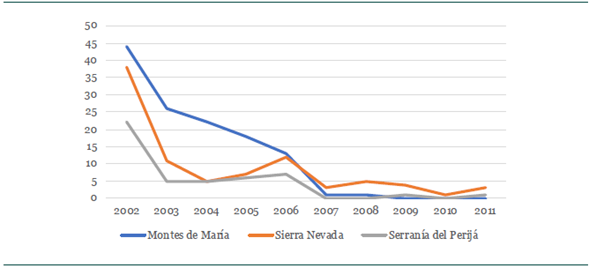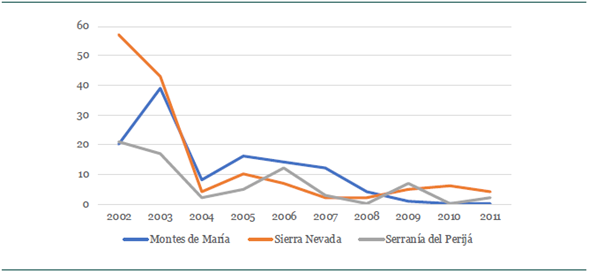 En las tres subregiones hubo un descenso significativo de la conflictividad hasta 2004. En 2005 hubo un pequeño repunte que solamente en la Serranía siguió en aumento hasta 2006. En esta última subregión, si bien hubo años sin acciones bélicas como 2008 y 2010, en 2009 tuvo un repunte, y después de finalizada la Seguridad Democrática volvió a aumentar en 2011. Por su parte, en la Sierra Nevada los hechos violentos volvieron a descender después de 2005 hasta llegar a su punto más bajo en 2007 y 2008. No obstante, para 2009 y 2010 aumentaron las confrontaciones y se mantuvieron con cifras similares en el 2011. La diferencia la marcó la región de Montes de María que después de 2005 tuvo un descenso continuo donde solo se registró un caso en 2009 y se mantuvo prácticamente en cero en 2010 y 2011.