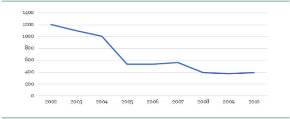 La disminución de la capacidad del Bloque Caribe también se vio reflejada en el número de combatientes. Con base en información de la Fuerza Pública se indica que el número de guerrilleros se redujo constantemente entre el año 2002 y 2010, pasando de contar con aproximadamente 1200 combatientes a 390 en este periodo, lo que significó un descenso del 67.5 % en unidades guerrilleras (figura 5). Sin embargo, la información desagregada del número de combatientes por frente es muy limitada; apenas se encuentra información judicial y de prensa que ofrecen datos incompletos. Es posible establecer que en el año 2002 el Frente 35 contaba con 220 guerrilleros mientras que el Frente 37 tenía 320;11 para el año 2012 el primero estaba totalmente desactivado mientras que el segundo contaba solo con 51 guerrilleros, los cuales se habían desplazado a zona de influencia del Bloque Magdalena Medio.12 Para el año 2012 se indicó que el Frente 19 contaba con 70 guerrilleros, el Frente 41 tenía 82 y el Frente 50 sumaba un total de 132, mientras que la compañía Efraín Guzmán13 tenía 93 (El Heraldo 2012).14