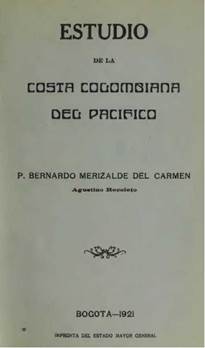 Como era costumbre en la orden, en 1921 Merizalde envió el manuscrito titulado Estudio de la costa colombiana del Pacífico a los frayes "censores" Rufino Pérez y Cándido Armentia, quienes le dieron el visto bueno en septiembre de ese año. El libro -publicado por la Imprenta del Estado Mayor General y que le mereció a Merizalde su ingreso a la Academia Nacional de Historia en 19228-, tenía 248 páginas, estaba dividido en 33 capítulos, un apéndice, bibliografía y una sección de "fe de erratas"; presentaba 27 fotograbados, un mapa de la costa del Pacífico y un plano topográfico de Tumaco (figura 3).