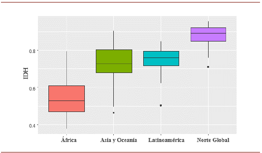 En la figura 1 se visualizan heterogeneidades que reflejan cómo el continente africano tiene desventajas notables en el Índice de Desarrollo Humano, al compararlo con Latinoamérica y Asia, los cuales, también están en desventaja frente a los países del norte global. Puede apreciarse como los países latinoamericanos y asiáticos tienen un IDH similar, aunque Latinoamérica tiene un grado de desarrollo humano más homogéneo entre países.