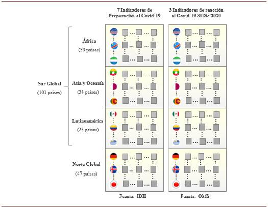 Para ambos conjuntos (Norte y Sur) se evalúan siete indicadores correspondientes a la preparación frente a la pandemia por el Covid-19. Dichos indicadores representan al sector salud, humano, social y de telecomunicaciones. También se consideran tres indicadores que miden la reacción de los países frente a la pandemia: el número de casos, muertes acumuladas y la letalidad -muertes entre casos acumulados- hasta el 31 de diciembre de 2020.