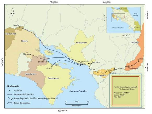 Ya desde 1886 hay referencias de venta regular y frecuente de ganado guanacasteco en la plaza de Alajuela. Incluso a mediados del siglo XX, pese a existir el tren al Pacífico y poder embarcar las reses en Barranca, muchos ganaderos prefirieron arrear el ganado hasta Alajuela (Gudmundson 1979). Este flujo comercial formaba parte de un sistema articulado de comunicaciones que reunía el cabotaje, los ferrocarriles y los caminos (Núñez-Arias y Marín-Hernández 2010). El resultado de ese sistema fue la vinculación de diferentes periferias a un orden económico ya que se intentaba con ello, desde finales del siglo XIX, conectar las zonas productivas aisladas del modelo agroexportador, incrementar el comercio con ellas y profundizar de este modo como ya se dijo la reorganización de los ecosistemas y los agroecosistemas. Si bien es cierto el auge del ferrocarril al Pacífico fortaleció la actividad del cabotaje entre Guanacaste y Puntarenas, la construcción de la carretera interamericana a principios de la década del cincuenta contribuyó al declive del servicio de transporte marítimo que realizaban dichas embarcaciones.