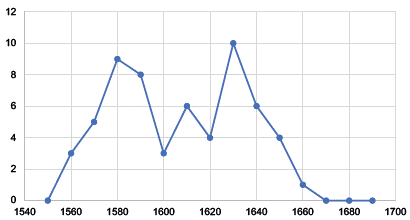 A lo largo del periodo de estudio, los 59 casos se distribuyen de manera discontinua, variando sustancialmente su cantidad entre década y década sin un patrón o comportamiento que pueda ser explicado totalmente por alguna coyuntura política o social. La década en que más querellas por injurias se presentaron en la temporalidad de estudio fue la de 1630 con diez casos, seguida por los decenios de 1580 y 1590, con nueve y ocho procesos respectivamente (figura 1).