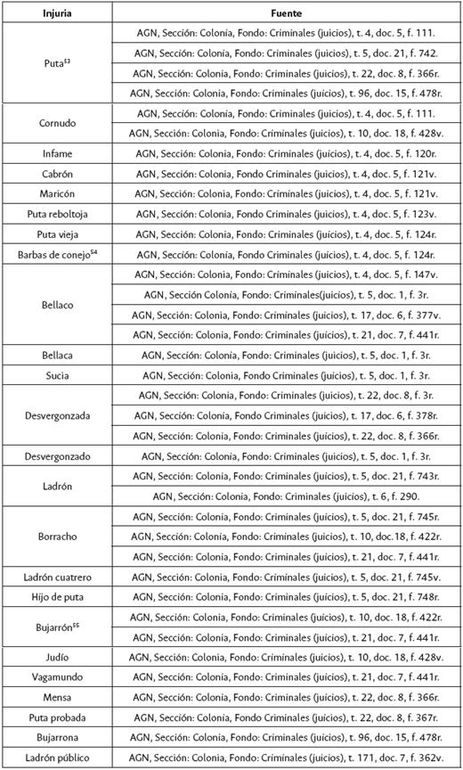 El tipo de injuria empleada en cada caso dependía de la esfera del individuo que se quisiera mancillar pese a que, en definitiva, proferir una injuria terminaba afectando el honor de una persona de manera íntegra, ya fuera por su difusión, por la cantidad y calidad de los testigos51, o, incluso, por el hecho de no haber reestablecido su honor por medio de la violencia52. En este sentido, en el periodo de estudio se identificaron injurias en forma de acusaciones, alusiones religiosas, conductas morales, distinciones raciales y referencia al padecimiento de enfermedades. La tabla 2 lista las injurias más utilizadas durante el periodo de estudio.