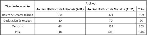 Para este artículo se recuperaron del Archivo Histórico de Medellín y del Archivo Histórico de Antioquia 1204 documentos que corresponden a los memoriales, boletas de recomendación y declaración de testigos que presentaron a la Junta de Manumisión de Medellín 335 individuos entre los años 1832 y 1852. La temporalidad y el tamaño de la muestra se determinaron por la disponibilidad de la documentación en los archivos. La tabla 1 evidencia la cantidad de documentación recuperada por archivo y tipo documental.