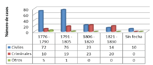 Por lo tanto, para estudiar los amores ilícitos en Medellín, es necesario remitirnos a la documentación civil. En cuanto a la fecha de producción de los expedientes revisados, el Gráfico 1 nos permite medir el impacto de la Real Pragmática en la trasformación de la sociedad, pues el recrudecimiento de las políticas de segregación parecía una contradicción en un contexto donde la población estaba cada vez más mezclada. Como vemos en la imagen, la emisión de casos civiles fue tres veces mayor durante las décadas siguientes a la implementación de la Pragmática (1776-1805) que en los últimos decenios analizados, los cuales coincidieron con el inicio y el desarrollo de las luchas independentistas (1806-1830).