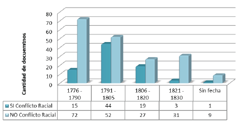 Por otro lado, la fase de 1821-1830 muestra una casi total desaparición de los conflictos raciales en la documentación. En el 91% de los casos revisado no hay recursos cuyo origen estuviera representado por un conflicto racial. Al respecto, debe recordarse que durante ese momento comenzó a desaparecer la categoría racial como descriptor de los demandantes. Sin embargo, esto no significa que después de 1820 haya desaparecido la exclusión relacionada con lo racial en la vida real y cotidiana.