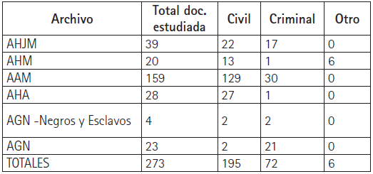 Para el periodo propuesto se consultaron los archivos siguientes archivos: Archivo Histórico Judicial de Medellín (AHJM) Archivo Histórico de Medellín (AHM), Archivo Arquidiocesano de Medellín (AAM), Archivo Histórico de Antioquia (AHA) y Archivo General de la Nación (AGN). El repositorio más rico en documentación para el tema de estudio resultó ser el Archivo Arquidiocesano. La Tabla 1 muestra un total de 273 documentos estudiados, de los cuales 159 fueron tomados de este último. Esta cifra demuestra una vez más la importancia heurística de los archivos eclesiásticos. Al respecto se debe recordar que las disposiciones alrededor del matrimonio tuvieron injerencia tanto eclesiástica como civil.6