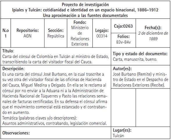 In Colombia and its border countries meets multiple factors that affect societies and spaces in these areas. This invites social scientists social to deepen their unders- tanding, addressing issues such as everyday life, land tenure and national identity. In this context, the current research was to identify and describe primary sources located in the cities of Quito, Tulcán, Guayaquil, Ipiales and Bogotá, in order to have a database to serve as a tool to understand and analyze consistently the past. Thus, the identified and described evidence base regarding this initiative provides a clear picture of the size, nature and location of a collection composed of 2420 pieces. Also, the work of documentary description allowed thematic series grouping, which outline their importance for research into the political, social and material life on the border of Colombia and Ecuador; the economic and administrative contingencies own border crossing; consular services; customs administration and joints and political processes (elections, party rivalries, regime changes, turns, etc.) that affected the lives of these societies.
