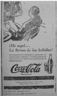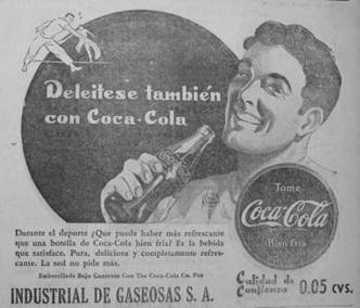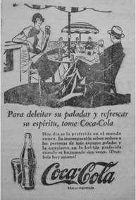 This history of Coca-Cola's first franchise with Postobón -which would become the largest and best-known Colombian soft drink company, Coca-Cola's main competitor, and Pepsi's Colombian franchise from 1970- has been virtually erased from official company histories of Coca-Cola and its bottlers, which narrate the origins of Coca-Cola bottling from the 1940s. But evidence of it remains in Postobón's early advertising of the product and Coca-Cola company magazines' celebratory mentions of the drink's first expansion into the country. Coca-Cola's earliest advertising in Colombia in the late 1920s and early 1930s demonstrates the complex representational politics of an international product constructed by both a growing multinational corporation and local franchises in Latin America. Postobón introduced Coca-Cola to Colombia with advertising produced by The Coca-Cola Company in the U.S. or the corporation's Latin American Division in Mexico City, selected by the Medellín-based executives for Colombian consumers. Advertising in El Heraldo de Antioquia, the Medellín daily newspaper with the largest circulation according to the Advertisers' Guide to Latin American Markets29, represented Coca-Cola as a sign of modern business and culture now available to Colombians. For decades, Latin Americans had purchased imported goods, especially from Europe, which held associations with modernity, and the quality and style emanating from "centers" of development and culture30. In the 1920s and 1930s U.S. products were relatively new to the Colombian marketplace. They also had to contend with recent events that threatened the perception of the U.S. in Colombia: U.S. assertions of economic power including, in 1928, U.S. lenders cutting off credit to the country in disapproval of government spending and recent legislation protecting national oil reserves31, as well as more violent assertions of the power of U.S. capitalists in Colombia, when, under a threat to Colombian sovereignty by U.S. military intervention to protect corporate interests, the Colombian army colluded with the United Fruit Company to massacre striking banana workers in Santa Marta in 1928 and was dispatched to Barrancabermeja to defend the Tropical Oil Company in 1927 and 1929. Strategically, then, Postobón's first Coca-Cola advertisements emphasized the global popularity of the drink, rather than its North American identity, asserting the class and culture universally associated with its drinkers around the world. According to the ads, Coca-Cola was the "preferred drink in the whole world" (figure 1).