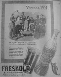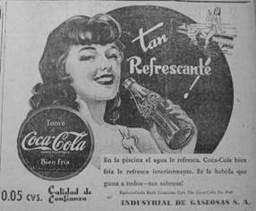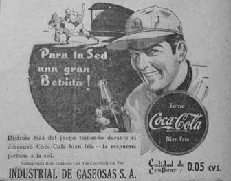 The Coca-Cola Company also dissuaded such potential threats posed by the labor and political left by casting itself in terms that might speak to the economic, political, and cultural interests of a developing nation. The franchise allowed The Coca-Cola Company to promote itself simultaneously as a global commodity representative of the modernity of developed countries and a local product enabling Colombian industry and consumers to develop and modernize. Thus, INDEGA and The Coca-Cola Company negotiated the shift from liberal developmentalist modernization in the first half of the twentieth century to the murmurings of more Keynesian developmental politics, achieved by putting forward local bottlers as conduits of national modernization. The Coca-Cola Company mobilized a modernization discourse, emphasizing the role of a modern drink and business in nation building, the construction of modern identities and institutions, and national industrial development. The imported Coca-Cola advertising continued to market Coca-Cola as the modern choice. The often-repeated tagline "Security, Protection, Hygienically Produced" represented Coca-Cola in relation to other local beverages, bottled or otherwise, that did not boast such modern claims in print. Emphasizing "quality," "purity" and painstaking "care and attention in its preparation", such ads suggested that Coca-Cola was safer than juices made on the street, fermented indigenous drinks or lesser-quality bottled soft drinks, which were not the products of modern technology. The Coca-Cola Company and its advertisers were also beginning to apply the modern theory of market segmentation, in which "homemakers," "workers," and the "youth market", were not just represented, but constructed as social categories in advertising. In the elite Conservative-party oriented daily newspaper, El Colombiano, advertisements promoted modern middle-class conceptions of leisure paired with consumption of Coca-Cola. Such ads promised not only thirst-quenching refreshment, but also the possibility of a making a choice in terms of consumption and recreation, both presented as self-defining activities with the new identities opened up by capitalist modernity. Produced by Coca-Cola corporate advertising agencies and adapted from U.S. pattern advertising prototypes by The Coca-Cola Company Latin American Division and the local Export offices and bottlers, the ads often contained characters with lightly darkened features and were translated into a generic Spanish language for a broad Latin American market (figures 8 and 9). This model of pattern advertising attempted to create slight variations within an advertising campaign that could be more locally relevant to diverse markets. Many advertisements demonstrate basic attempts by INDEGA to identify images amongst the offerings from The Coca-Cola Company's global marketing provisions that applied to Colombian culture and context. An example of this is The Coca-Cola Company's "Drink Coca-Cola-Ice Cold" campaign that emphasized the thirst quenching refreshment of ice cold Cokes through images of recreation and sport, producing series of ads that drew on the simultaneously multinational and local appeal of transnational sports. INDEGA chose swimming, jai alai (from Spain) and baseball (from the U.S.), the latter two newly popular in Colombia, over other pattern advertising options such as American football and skiing, for example (figures 10 and 11).