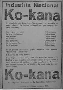 While the Colombian government and marketplace was open to U.S. foreign investment and brands, the global depression of the 1930s and economic slowdown during the course of World War II fueled critiques of the Colombian economy's dependency on the United States. The Colombian government passed a 1936 constitutional amendment that gave the state the right to expropriate private property "for motives of public utility and social interest", both of which worried U.S. multinationals (especially the oil companies) doing business in the country57. The threat of expropriation was not acted upon, as López's reforms were derailed by WWII and the Colombian support for the allies abroad, and also by the political conflict at home, including a failed presidential coup, a presidential resignation, and the devolution into large scale political violence in the late 1940s that continued through the 1950s. Despite the lobbying that favored Colombian manufacturing interests, López never fully endorsed protectionism, viewing tariff barriers instead as "a tax on many to benefit the few", which increased prices on foreign goods, fomented monopolies and depressed wages in protected sectors, thus negatively affecting the working class, such as consumers and workers, while enriching the industrial elite58. But Colombia's manufacturing elite continued to promote the sense that Colombia's future was industrial and in need of state subsidy and protection59. As early as 1930, a competing product, Ko-Kana, was already attacking Coca-Cola's vulnerable otherness, a sign of the growing challenge posed by more national-oriented conceptions of economic development to liberal developmentalist modernization, as Colombia began to experience the effects of a global depression. In comparison to the conscious appeals to universality and accidental foreignness that marked the Coca-Cola ads, Ko-Kana emphasized that it was a "national industry" in every link of its commodity chain: "It is notable the great number of Colombians that this great industry employs: Its corona tops, Colombian; its carbonic gas, Colombian; its labeling, Colombian; its sugar, Colombian; its bottles, Colombian; its advertising, Colombian; its Business, Colombian". Produced by the "Colombian spirit", the product had been embraced by the Colombian public in a true example of "Colombian Protection", per the ad (figure 7).