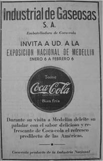 As Colombian newspapers printed daily headlines of U.S. military valor against fascism in World War II, along with reports of American Good Neighbor policies, and as the Colombian elite increasingly published anti-communist tracts, the association of these advertisements with the United States granted ads the acceptable modernity of capitalist liberalism in relation to other political options. But efforts were made in advertising to assert the Colombian-ness of Coca-Cola products. Each ad ended with the requisite "Embotellado Bajo Contrato Con The Coca-Cola Co. por..."61 and left space for the local bottler to fill in its company identification, in this case, "Industrial de Gaseosas", in order to assert Coca-Cola's local production. To be an "American" product, even in a time of relative American popularity in Latin America, was becoming more complicated, especially in Medellín, center of the rising Colombian industrial elite, amidst emerging calls for the protection of Colombian products in the face of (largely American) imports. INDEGA's sponsorship of the 1944 Exposición Nacional de Medellín, a celebration of Medellín's industrial prowess, provided an opportunity for the local bottling company to support the promotion of local industry, and to assert itself as a member. In this Colombian representation, Coca-Cola was both "the favorite drink of the Americas" and a "product of National Industry" (figure 12). From the U.S. perspective, as provided by a reporter from Women's Wear sent to the Medellín exposition to cover the growing textile industry, Coca-Cola's presence was a sign of the city's entrance into modernity: "It has all the entertainment features of our own fairs... 'Coca-Cola' is especially conspicuous and popular"62.