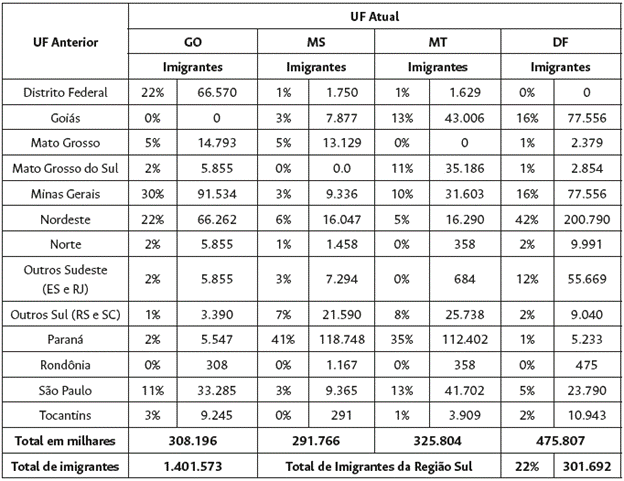 A tabela mostra a ocupação dos chefes de família economicamente ativos, em números totais e percentuais, a fim de apurar a participação dos imigrantes na formação da classe proprietária de terras da região e a sua participação na classe trabalhadora. Os dados foram tabulados com a exclusão do Distrito Federal, já que tal região concentra grande contingente de servidores públicos, enquadrados no setor de serviços, realidade incompatível com a observada no restante da região. Dos 224.046 chefes de família que migraram para a região nos anos 1970, 16,6% eram empregados da agropecuária, 37,4% da indústria, comércio e serviços, 3,1% trabalhadores agrícolas volantes e 0,5% parceiros ou meeiros empregados, totalizando 57,5% dos chefes de família imigrantes na condição de empregados/trabalhadores. 41,7% eram, de alguma forma, autônomos ou trabalhavam por conta própria, sendo que 17,8% eram autônomos na agricultura e 5,7% empregadores sem remuneração e, portanto, proprietários de estabelecimentos agrícolas ou não agrícolas. Em Mato Grosso, os autônomos da agricultura e empregadores chegam a somar 23,5% dos chefes de família.