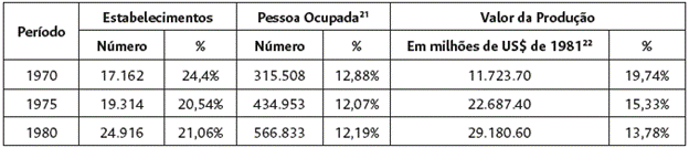 Fonte: Instituto Brasileiro de Geografia e Estatística (IBGE), Censo Industrial de 1970, (Rio de Janeiro: S.e., 1970); Instituto Brasileiro de Geografia e Estatística (IBGE), Censo Industrial de 1975, (Rio de Janeiro: S.e., 1975) e Instituto Brasileiro de Geografia e Estatística (IBGE), Censo Industrial de 1980, (Rio de Janeiro: S.e., 1980).22