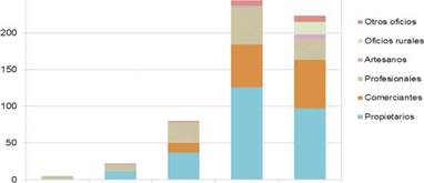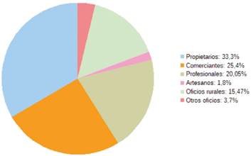Propietarios: 33,3% Comerciantes: 25,4% Profesionales: 20,05% Artesanos: 1,8% Oficios rurales: 15,47% Otros oficios: 3,7%