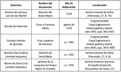 Tabla 1: Primeras relaciones del Nuevo Reino de Granada
