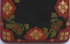 En tercer lugar, la gran carga decorativa inspirada en el mundo vegetal, y combinada con animales es otro aspecto común, aunque salvando la distancia entre la naturaleza japonesa y la centroamericana. Bien es cierto que el afán de cubrir la superficie con abundantes elementos ornamentales es una característica propia del Barroco europeo, y la tupida decoración de tipo horror vacui es de raíz mudéjar e islámica. Sin embargo, encontramos paralelismos bastante claros entre la laca japonesa namban y el barniz de Pasto, por ejemplo, en la combinación de los elementos vegetales y animales de modo muy cargado. Mitchell A. Codding señala la gran similitud entre los motivos decorativos muy tupidos que figuran en la tapa del escritorio con el escudo de la familia Quirós -monos combinados con flores de la pasión-, perteneciente a la Hispanic Society of America, y los motivos frecuentemente usados en la laca de las islas Ryukyu -ardillas con vides-10. Además, la constante presencia de marcos con motivos geométricos o roleos es otro rasgo común. Incluso hallamos motivos casi idénticos enmarcando las escenas en las arquetas de laca namban y las del barniz de Pasto. Verbigracia, el marco de la arqueta de barniz de Pasto perteneciente a la catedral de Pamplona (Navarra, España) muestra una sucesión de rombos en disposición diagonal, motivo que recuerda a la cadena de shippô, motivo tradicional japonés, frecuente en las lacas namban (ver figura 6). Y en el antedicho escritorio del Museo de América, observamos también una cadena de círculos con cuatro rombos dorados en su interior, motivo tradicional japonés llamado yotsuwariishi (ver figura 7).