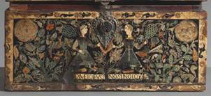 Con respecto a la técnica del barniz de Pasto, los colores verde azulado, naranja y amarillo con efectos metálicos son preciosos (ver arriba figura 2). El verde azulado nos evoca el aspecto de la esmeralda, mientras que los colores naranja y amarillo nos recuerdan el efecto de makie de la laca japonesa urushi (ver arriba figura 3). Las láminas de plata están cuidadosamente recubiertas con membranas de otros colores, de tal manera que, a pesar del paso del tiempo, apenas muestran oxidación o ennegrecimiento. Otro aspecto interesante de la obra que la hace singular es la presencia de varios textos, algunos en español y otros en latín. Estos breves enunciados combinados con determinadas imágenes tienen claramente sus orígenes en los emblemas y textos moralizantes, tan en boga en la España de los siglos XVI y XVII20. Asimismo, el uso de filacterias para presentar los motes, como observamos aquí, es muy habitual en el mundo de los emblemas.
