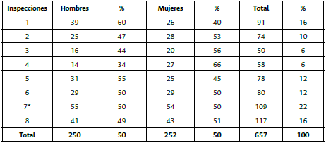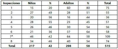 En cambio, la enfermedad pegó con más fuerza en la población de adultos (58 %) que en los niños (42 %) (tabla 2 y figura 3). Las inspecciones 1, 6 y 7 aparecen como las más afectadas para los adultos. Las demás inspecciones guardaron más bien un equilibrio.