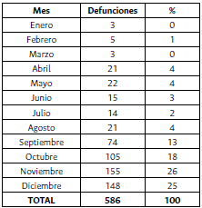 De la letalidad no se dispone de información por inspecciones, sin embargo, los registros muestran los casos por mes (tabla 3 y figura 4), lo que presenta de manera clara la evolución, que resulta tanto o más importante, porque proporciona de manera clara la evolución anual y la estacionalidad del tifo. No hace falta mayor explicación para observar el desarrollo de la epidemia durante los meses de octubre, noviembre y diciembre de 1892.