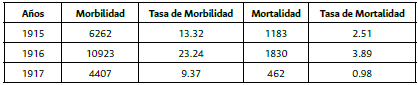Tabla 4: Morbilidad y tasa de mortalidad, 1915-1917