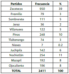 Resulta claro que los partidos de Zacatecas y Sombrerete son los que mostraron mayor incidencia de las enfermedades, tal vez porque Fresnillo fue un partido con una presencia del mundo agrario más amplio, lo que para fines de estas enfermedades era importante, porque no propiciaba el hacinamiento propio de las ciudades.
