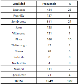 El mayor porcentaje de defunciones se produjo en la primera y segunda semana de diciembre (figura 7), aunque era más factible pensar que la que la mayor incidencia se debía haber producido en las dos semanas siguientes por ser una época de frío más intenso. Por otro lado, también tenemos información de cómo se comportó la epidemia en relación con los partidos. Es claro que el partido de la capital fue el más afectado al reunir el 39 % de casos, aunque no fueron pocos los casos de Pinos, Nochistlán y Sombrerete. Nieves con Jerez, en cambio, fueron los que presentaron menor incidencia (figura 8).