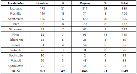 La tabla 13 y la figura 15 muestran la distribución espacial de las enfermedades. Se observa que en términos del tifo la ciudad de Zacatecas tuvo casi el 70 % de casos registrados, seguida por Sombrerete. No fue Fresnillo un caso representativo, incluso frente a Pinos y Mazapil. De todas formas, si bien las dos epidemias tuvieron expresiones diferentes, ambas fueron letales. En términos del sexo (tabla 14), el comportamiento de las enfermedades, no tuvo grandes diferencias, prácticamente en el caso de 1893, ambas mantuvieron una expresión similar.