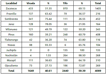 Por lo general pareciera que la epidemia de tifo gozó de mayor mención en la historiografía, pero la viruela alcanzó el alto porcentaje de 40.61 % de casos en 1893, aunque sin duda en la capital del estado fue menor con 31.35 % (tabla 13). La viruela pegó fuerte en Fresnillo, Sombrerete y Jerez, con porcentajes que iban desde el 63.42 % al 78 %. De todos los casos comparados.