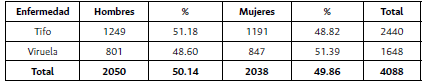 Por último, en términos de la estructura de la mortalidad por sexo, las defunciones tuvieron una expresión cuantitativa muy similar, pero en el caso del tifo la mortalidad de hombres (51.18 %) fue superior a la de mujeres (48.82 %) y, por el contrario, en el caso de la viruela la distribución se invirtió: 48.60 % de las muertes correspondieron hombres y el 51.39 % a mujeres.