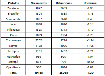 Los informes están de acuerdo en que prácticamente el 50 % de los enfermos se cuidaban -¿y morían?- en sus casas, lo cual permite a calcular el número de defunciones fuera del Hospital y el lazareto. Para este ejercicio se parte de que en 1893 en el estado de Zacatecas murieron 4088 personas y que el total de las defunciones fue de 25 088. A continuación, se compara con 1895, un año normal, en donde el total de defunciones fue de 15 187 y, por tanto, el excedente de defunciones fue de 9901 casos. Si de esta cantidad se restan s las cifras oficiales registradas, 4088, se tiene que 5813 personas murieron en sus domicilios, es decir, el 58.71 %, cifra que estaría de acuerdo con las estimaciones del 50 % que mencionaron las autoridades. Es claro que estamos mezclando enfermedad con defunción. Con base en 500 000 habitantes, el cálculo demográfico de la época, hecho por Elias Amador para todo el estado, muestra que el 3.3 % de los datos correspondían a nacimientos, el 5.91 % a defunciones y el 0.54 % a matrimonios24.