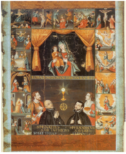 Figure 2: The Virgin Mary with the Infant Jesus and Her Fifteen Mysteries, Loyola and Francis Xavier