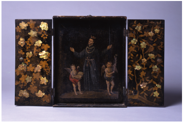 In recent years, interdisciplinary studies have contributed to the development of new knowledge. Kamba and Kojima carried out technical studies of the two above-mentioned works of The Virgin Mary with the Infant Jesus and Her Fifteen Mysteries, Loyola and Francis Xavier (figures 2 and 3) in order to analyze the relationship between them in terms of materials and pictorial techniques. This study was complemented with Mitsuru Sakamoto's formal and iconographie analysis61. Hitomi Asano also conducted technical studies of a plaquette of Madonna of Loreto (Nakatani collection)62, and of a painting of Our Lady of the Snow (collection of the Twenty-Six Martyrs Museum) in cooperation with the restorer Eri Takeda63. The interdisciplinary perspective is also reflected in the curatorial discourse of exhibitions such as "Portugal, Jesuits, and Japan: Spiritual Beliefs and Earthly Goods", held at the McMullen Museum of Art, Boston College in 2013. The works of nanban art -mainly folding screens-have been analyzed, exploring and interrelating Jesuit mission, cartography, trade network, mechanism of production, and interregional artistic exchanges64.