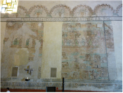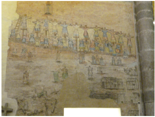 These murals are composed in order to be seen from the main chapel towards the nave. The narrative scenes are developed chronologically from the south wall to the north one, taking the Historia de las islas del archipiélago filipinoy reinos de la gran China, Tartaria, Cochinchina, Malaca, Siam, Cambodgey Japón (1601) by the Franciscan Marcelo de Ribadeneira as its main literary source. The south wall is divided into large squares depicting public humiliations: the prisoners, in groups of four, are pilloried in oxcarts through the city of Kyoto (see figure 8), instead of "three for each cart" as Ribadeneira describes87; and then follows a scene where they are forced to march by means of horse carts through the main streets of Osaka and Sakai88; the north wall has no separation between scenes showing uninterruptedly the boats heading to Nagasaki (see figura 9), the Portuguese receiving them at the port, and finally culminating in a scene of martyrdom on a hill (see figure 10)89.
