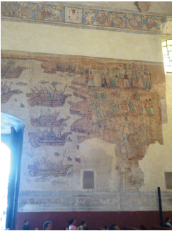 Instead, Father Pacheco (Yüki), Ota Mishima, and Fontana Calvo question the participation of an Asian painter in the execution of the murals. Even though the painting on the north wall resembles a giant screen without architectural frames dividing scenes, the details such as houses, carts, and spears are not in accordance with the Japanese historical context95. According to Pacheco, these works might have been executed by native painters who probably saw Hasekura's embassy passing by. This delegation consisted only of men. Local painters could directly observe Japanese masculine costumes, but they had to rely upon their imagination to depict female garments. Perhaps for this reason masculine clothing coincides with the kimono worn at that time, while female clothing is completely different96.