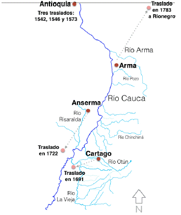 Las dos riberas del valle del río Cauca fueron exploradas en 1536 por Sebastián de Belalcázar con sus huestes y Pedro Cieza de León asentó las noticias sobre la provincia de Cartama-Anserma y la llegada del capitán Miguel Muñoz al río La Vieja. Poco después, se dieron las incursiones más sistemáticas de Robledo que buscaba afianzar las posesiones de Francisco Pizarro en la zona a través de la fundación de poblados como Santa Ana de los Caballeros -Anserma- (1539); Cartago (1540) y Santafé de Antioquia (1541), a lo que se añadiría el asentamiento de Arma (1542), que haría parte de los litigios que se presentaron entre Belalcázar y Robledo14.