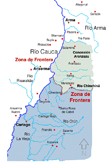 Haga Ud. entender bien a los pobladores el citado contrato para el caso de que el terreno de la Aldea esté comprendido entre los límites de su titulo, así como que los límites más naturales entre las dos provincias son el río Chinchiná desde su desembocadura en el Cauca aguas arriba hasta Lagunetas.38