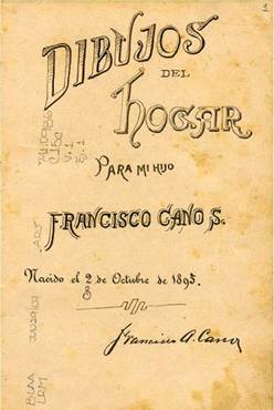 La libreta incluye una portada interior, once dibujos y una página manuscrita con las fechas de nacimiento de sus tres hijos. En la primera hoja se puede leer: "Dibujos del hogar para mi hijo Francisco Cano S. nacido el 2 de octubre de 1895" y está firmada Francisco A. Cano (figura 5). Esta primera fecha propone un punto de inicio para comenzar a entender este libro de bebé, aunque es posible, como ya se mencionó anteriormente, que la libreta se haya adquirido en París y que la dedicatoria y los dibujos hayan sido hechos a su regreso, cuando Francisco hijo ya tenía 3 años. La libreta está dedicada a este hijo mayor, aunque varios dibujos incluyen a los otros hermanos. Cano se casó con María en 189614 y tuvo cinco hijos de los cuales dos fallecieron siendo aún muy pequeños. Los tres que sobrevivieron fueron Francisco, nacido en 1895, Solita y León-Enrique, artista como su padre, que nació el 8 de agosto de 1901.