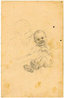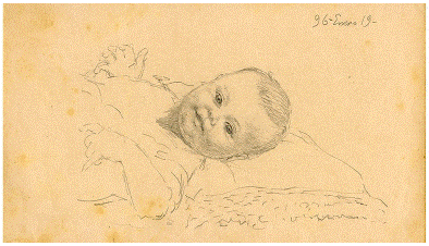 La siguiente página muestra también a un bebé que parece un poco distinto al de la página anterior pero muy parecido al que sostiene la supuesta abuela (figura 11). Se asume que es Francisco nuevamente y no León-Enrique porque Cano fechó este dibujo, "96-Enero 19". Si León-Enrique nació en 1901, como lo inscribe su propio padre más adelante en el folio 9, pues no habría nacido en la fecha del boceto, y si Francisco había nacido en octubre de 1895 como Cano declaró en la primera hoja, entonces este dibujo es de ese niño con tres meses cumplidos. Nuevamente resalta el talento de Cano para expresar ternura por medio de suaves líneas, pero adicionalmente en este caso hay una voluntad por expresar movimiento en las manos y los gestos del retratado. Sugerido por rápidas y cortas líneas, la fragilidad del movimiento se define en el dibujo y en la sonrisa juguetona del bebé.