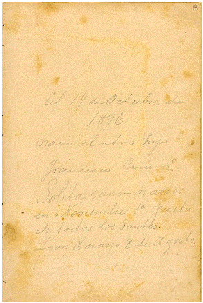 El folio 8 (figura 12) no es un dibujo pero tiene texto manuscrito que dice, "El 17 de Octubre de 1896 el otro hijo Francisco Cano S. nació. Solita Cano nació en Noviembre 1.o, dia de todo los Santos. León-E nació 8 de agosto". La única posible confusión con estas fechas es la del primer niño, su propio padre ha escrito en la primera hoja que el libro está dedicado a su hijo Francisco Cano S. "nacido el 2 de octubre de 1895". Esto nos lleva a suponer que uno de estos dos Franciscos murió y el otro vivió, pues sus fechas de nacimiento distan por un año. Si el dibujo 7 (figura 11) es del primer Francisco de 1895 cuando este tenía tres meses, entonces cuando Cano escribe aquí "el otro hijo Francisco nació en 1896", es probable que este niño haya fallecido, aunque aún no se dispone de documentos para concluir esto como una certeza.
