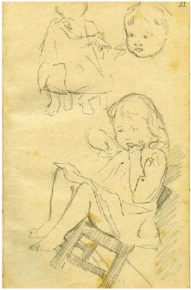 Algunos dibujos tienen fechas y nombres, otros son simplemente rápidos esbozos de los infantes cuyo significado intentamos deducir dentro de lo que sabemos de la historia familiar. El dibujo 10 muestra a uno de los varones, pareciera Francisco ya más grande, sentado en una silla sonriendo con un gesto pícaro. Lo cubre algo como una bata, lo imaginamos como sentado esperando a que le corten el pelo cuando su padre casualmente pasa por ahí y lo ve, toma rápidamente esta libreta y lo congela en el acto juguetón de mecerse en la pequeña butaca (figura 14). A pesar de tener todas las características de un boceto, y lejos de ser un dibujo elaborado, la expresión del rostro del niño es lo que llamó más la atención del pintor. Podemos traer a colación nuevamente esta noción de niveles o etapas de terminación de un dibujo abocetado. Con el número 11 aparecen una serie de tres dibujos rápidos de quien parece ser su hija Solita (figura 15). Perfecta prueba del papel del boceto como práctica, como error y como análisis, un dibujo es solo de su cara, otro de su cuerpo y el tercero de Soledad recostándose hacia atrás sobre una pequeña silla, al mismo tiempo llevando sus brazos a su rostro en un gesto obviamente infantil. El ángulo de la pared contra el cual ella se apoya es sugerido por una línea angular y por el veloz sombreado en zigzag.
