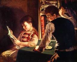 La libreta que se estudia aquí está dedicada exclusivamente a los tres hijos de Cano. Sin embargo, es interesante ver la niñez como una parte esencial del corpus de su obra. Hay muchas pinturas con este mismo tema, especialmente imágenes que tienen que ver con niños en escenas de intimidad y que no parecen haber sido encargos oficiales. Al describir diferentes momentos donde este interés temático del artista es evidente, Londoño-Vega y Londoño-Vélez observan que "En otro conjunto de obras se acentúa el interés realista: posan como modelos en el estudio del pintor, alegran la vida de la madre a pesar de las dificultades de la crianza, o aparecen leyendo en una exaltación del valor civilizador del estudio a temprana edad"26. Una pintura bastante conocida de Cano es La niña de las rosas de 1904 (figura 21). Teniendo en cuenta que su hija Solita era la hija de la mitad, nacida entre 1895 y 1901, podemos suponer que ella es la modelo: la pintura muestra a una niña en un típico patio antioqueño podando tranquilamente las rosas de un arbusto. Su acto solitario e introspectivo recuerda algunos de los ejemplos de la libreta. En esta obra Cano "[...] retrató a su propia hija, quien corta rosas en un soleado jardín, estableciendo un parangón entre la belleza e inocencia de la pequeña y de la naturaleza"27. En el caso de El estudio del pintor de 1885 dos niños se encuentran parados en el estudio mientras que el pintor trabaja; por tal razón parece que los niños no solo eran modelos, sino una presencia constante en la vida activa del taller (figura 22). Como ya sabemos, Cano se casó con María Sanín en 1894 y su hijo mayor nació en 1895. Esto significa que los niños de esta obra no eran sus hijos, pero su presencia parece anticipar la futura importancia de los niños en la vida personal y creativa del artista. Algo similar sucede con Mis modelos de 1892 (figura 23), en el que aparecen dos niños que pasan el rato en el taller del artista, en un momento de descanso cuando el pintor ha dejado de lado la paleta y los pinceles sobre una silla y los niños se asoman para ver el progreso del cuadro. De este mismo año es La lectura o niños leyendo (figura 24), una pintura suavemente iluminada por una vela, donde la mecha está siendo tapada a la vista del espectador por el brazo del joven, y donde aparecena los dos muchachos en una complicidad íntima detrás de lo que parece ser una revista que están leyendo.