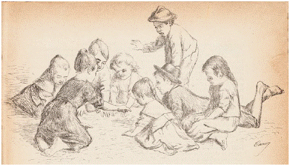 Otro ejemplo de la cercanía de Cano al tema de los niños es La Pizingaña, un grabado sin fechar que muestra a un grupo de ocho niños jugando el típico juego antioqueño donde se canta la canción de la pizingaña a la vez que se le pellizca la piel de las manos a los amigos hasta llegar al final de la rima (figuras 25 y 26). El trabajo de línea y de entramado permiten que la textura y la luz marquen un ambiente de picardía, ya que no hay adultos en la imagen. En cuanto a su trabajo como ilustrador y grabador, la imagen de la portada de la primera entrega de la revista Lectura y Arte, muestra a una niña y a un niño. Ella está leyendo y él está concentrado escribiendo o dibujando (figura 27). Podemos encontrar una fuente evidente de este grabado en el dibujo de la página 13 de la libreta en cuestión.