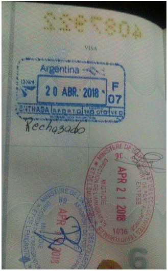 En este punto, la polisemia de la frontera puede ser comprendida a través de la categoría de deportabilidad71, la cual remite a la posibilidad de ser deportado de un determinado territorio nacional, en este caso concreto, aplicando la noción a la posibilidad de no ser admitido en Argentina y devuelto al país de origen, Haití. Esta devolución también es entendida por muchos de los jóvenes como una deportación y simbólicamente representada como un momento de quiebre en las posibilidades de proyectos migratorios presentes y futuros. Aunque, en algunos casos, se sostiene que ellos o sus amigos, conocidos o familiares lo volverían a intentar, en general, el rechazo se percibe como un gran obstáculo para el devenir de posibles viajes, una mancha en un pasaporte de por sí ya desvalorizado. Así como aparece representado en la figura 2, desde las percepciones de los y las jóvenes en general, el rechazo queda plasmado en el pasaporte como un antecedente que puede obstaculizar futuras movilidades.