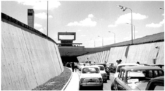 The three works were completed in a very short period of time (1967-1969-1971), and they were all carried out in the framework of developmental policies. During this period the new materials (although not all) began to be available nationwide. This, besides the new theoretical tendencies in architecture (systems theory, brutalism, megastructures, megaforms) and the outstanding role of the engineers (some of them military) made it possible for concrete to become people friendly. With these factors in mind, it is possible to comprehend a technological conception around the great spans and the aesthetics of concrete, understood as an acceptance of values and representations linked to certain technologies. This was already at stake in the discipline of architecture long before, but it appeared into the view of the passers-by from this moment onwards. The automobile boom and driving, understood as a civic activity and no longer as a technical capacity36, allowed the usual ride both in architectural works at an urban scale, and infrastructure at a territorial scale.