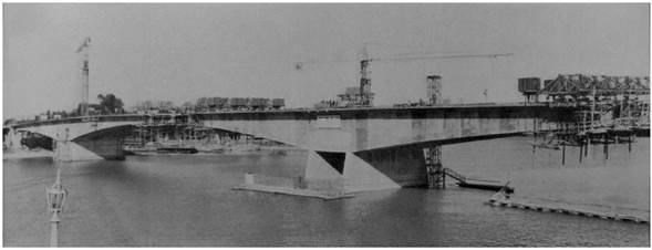 The work included viaducts at both ends, accesses and asphalt paving. Later on, defences were added on Santa Fe side. The bridge has a span of 300m and it is divided into three sections, that is to say, that it has two supports in the river. It also bears sidewalks and two roads, each 7.5m wide, separated by a stone division. The structure is made up of two main beams of reinforced concrete, of variable height, prestressed box type, built in successive sections by voussoirs measuring 3.11m. The bases are supported by 22 piles sunk between 15m and 25m below the scour level and with a diameter of 1.5m: so far, the largest in the country. As in the case of the bridge over the Colastiné, the Freyssinet system was also used here, but with the exceptional variant of using 24 0 7 cables that bifurcate before reaching the anchor, allowing a better use of the concrete, which was heated with steam to absorb the climatic variations in the hardening stages. The proximity of the viaducts to the urban area was taken into account, therefore, the one on the Santa Fe side shows curved branches that cross landscaping areas. Both ends are supported by Franki piles of variable length and 70 cm diameters. A system called "lost formwork system" was used for building piles next to the coast. The whole work played a fundamental role in the unusual flood of the Paraná River in 1982 since one of the consequences of this phenomenon was the destruction of one of the bases of the "Colgante" Bridge (made in a semi-rigid iron structure) rendering it useless and leaving the Oroño Bridge as the exclusive terrestrial communication (figures 7 and 8).