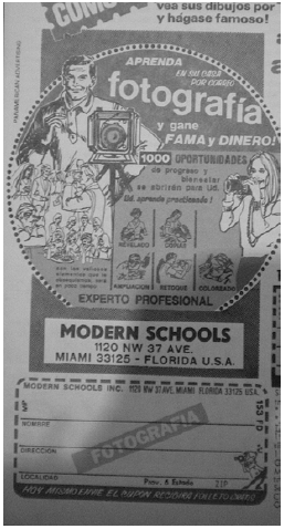 Los clásicos cursos por correspondencia para aprender a fotografiar tenían entre sus posibles lectores a mujeres; estas eran consideradas tanto en los textos como en las imágenes con los cuales se promocionaban. En la revista Mecánica Popular, la Escuela Fotográfica Sudamericana ofrecía la posibilidad de aprender fotografía desde la propia casa y podía leerse: "PARA AMBOS SEXOS: la fotografía es desempeñada con igual eficacia por hombres y mujeres a través de mil oportunidades: sociales, niños, retocados, etc."38. También las publicidades de los cursos por correspondencia llamados Modern Schools utilizaban representaciones de mujeres operando máquinas fotográficas en los avisos de sus cursos por correspondencia.
