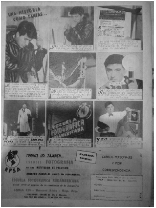La Escuela Fotográfica Sudamericana (EFSA) ofertaba cursos básicos y de especialización, según las necesidades del solicitante. En este caso, la representación visual del destinatario de los cursos o de "los profesionales de reconocida idoneidad" que los dictaban es un hombre en posición de concentración, con un gesto que revelaba la tarea laboriosa que realizaba para tomar la fotografía y que se distanciaba mucho de solo apretar el botón. Las otras imágenes de la publicidad integradas por una ampliadora o una cámara con trípode -aparentemente una cámara cinematográfica- también eran referencias a la profesión de fotógrafo. En general, desde los discursos publicitarios, la profesión de fotógrafo era una opción solamente masculina. Un anuncio de 1960 de la EFSA en formato de historieta a página entera narraba "una historia como tantas": la de convertirse en fotógrafo profesional (figura 9).